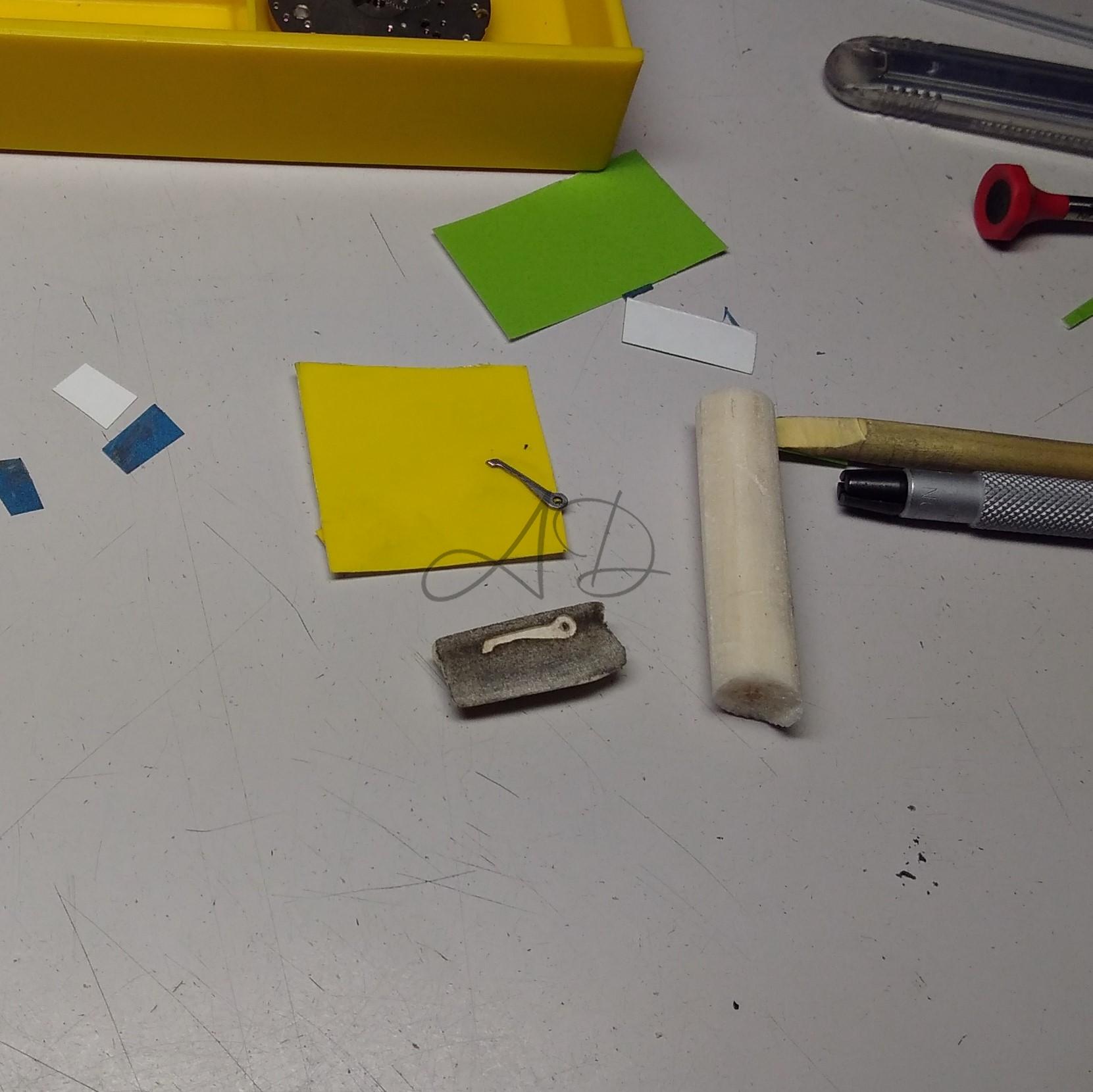 Si parte da una lastra in ferro leggermente più spessa del pezzo originale. Nel caso si disponga di una fresatrice o di un trapano a colonna, si comincia forando il materiale con una punta dello stesso diametro del perno impiantato nella platina; dove invece non sia disponibile né il trapano né la fresatrice, si può centrare il pezzo, incollandolo con l'ausilio della gommalacca, utilizzando la specifica pinza al tornio e quindi forare direttamente con la contropunta. Una volta creato il foro iniziamo a costruirgli intorno la nostra bascula. Per tagliare la forma del pezzo esistono diversi metodi, vi descrivo il mio: inizialmente ho utilizzato un seghetto da traforo per dare una prima forma al pezzo. Il seghetto, per chi come me non è molto pratico ad utilizzarlo, lascia ancora lontani dalla forma desiderata e per velocizzare la procedura ho utilizzato un trapanino da banco (tipo dremel) per togliere il materiale palesemente in eccesso. A questo punto la bascula inizia a prender forma; si passa quindi alle varie lime da orologiaio per rifinirla al meglio. Durante questa prima rifinitura si cominciano ad eseguire le prove di funzionamento della bascula, tenendo conto di tutti i fattori che interagiscono con questo elemento: il foro ha il giusto gioco nel perno, la bascula interagisce bene con la sua molla, l'altezza non è di intralcio per il copribascula, il corpo della bascula entra con il giusto gioco nel taglio del ruotino ballerino, nella posizione di rimessa il ballerino ingrana correttamente con il ruotino intermedio, il finale della leva arriva con il giusto angolo a contatto con il tiretto. Una volta che tutte queste misure risultano adeguate, si procede con il controllo finale del funzionamento della stessa. Qui sopra possiamo vedere la pinza del tornio utile per centrare la lastra con l'ausilio della gommalacca. Nelle due immagini che seguono, possiamo invece apprezzare come la bascula svolga correttamente il proprio funzionamento.