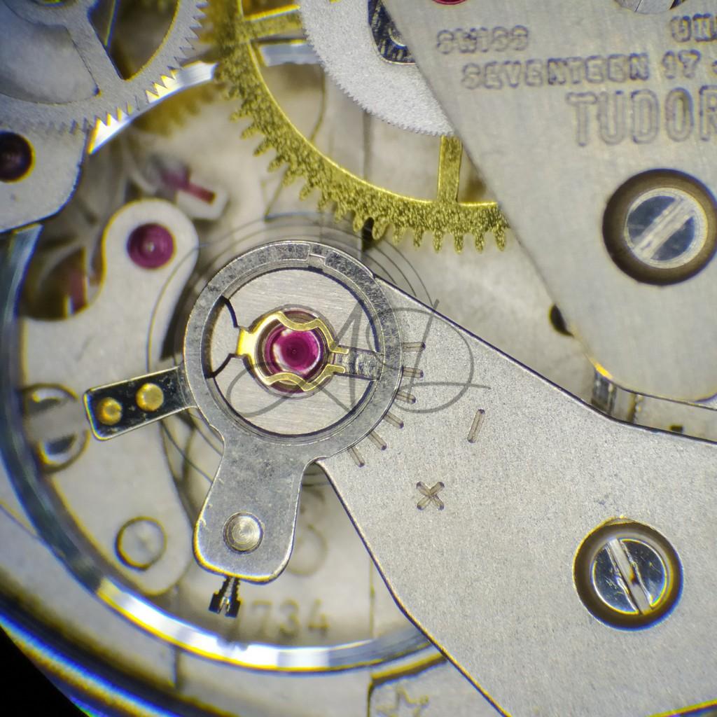 Sul banco un bellissimo cronografo vintage prodotto dalla Tudor nei primissimi anni Settanta. L'orologio, conosciuto come "Tudor Montecarlo", viene identificato dalla referenza 7031/0. Il meccanismo cronografico utilizzato nel segnatempo è un affidabile Valjoux 7734 a carica manuale con trasporto dei secondi continui ad ore nove e contaminuti ad ore tre, oltre ovviamente alla finestrella della data posizionata ad ore sei. L'oggetto nel corso degli anni è stato soggetto a diverse revisioni "certificate" con varie scritte all'interno del fondello e, grazie alle costanti attenzioni ricevute, quasi tutte le componenti meccaniche appaiono conservate in discreto stato sia estetico sia funzionale. Diverso è il discorso per i componenti esterni dove il bracciale cassa e fondello risultano molto vissuti con svariati segni del tempo e il quadrante ha diverse fioriture dovute molto probabilmente all'ingresso di umidità all'interno dell'orologio. Oltre i cinquanta anni di attività, anche l'umidità ha causato la caduta del trizio dalla lancetta delle ore. In accordo con il cliente si è cercato di ripristinare il trizio della lancetta e si è proceduto con la revisione completa dell'intera meccanica del segnatempo.