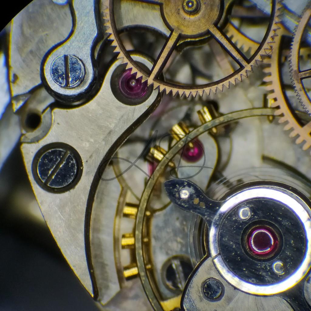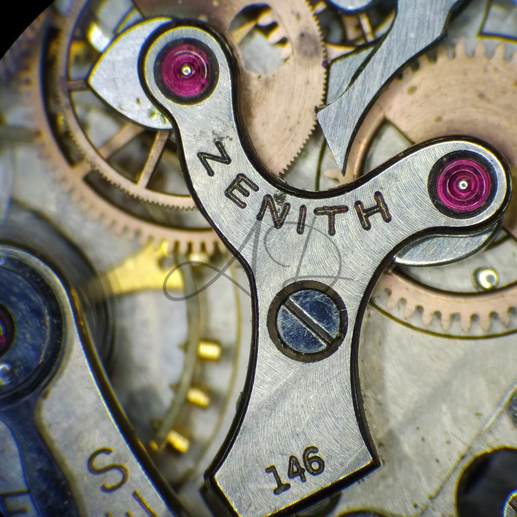 Sul banco un bellissimo cronografo vintage prodotto dalla Zenith. Il segnatempo incassa uno dei calibri più belli prodotti dalla ditta di Le Locle, il 146. Il 146 è un movimento cronografico con ruota a colonna e conta-minuti ad ore tre. Questo però non è l'unico aspetto affascinante dell'orologio, infatti, il bellissimo quadrante con tripla scala esterna risulta davvero magnifico. Le scale sono rappresentate in tre diversi colori: in blu quella tachimetrica, in rosso la telemetrica, mentre in nero troviamo la divisione dei quinti di secondo del cronografo. Un problema molto ricorrente in questi meccanismi è nell'eccessiva usura dei componenti che permettono la ricarica dell'orologio. Nello specifico, la meccanica risultava in discreto stato generale ma ha necessitato di qualche piccolo accorgimento aggiuntivo per poter tornare a svolgere correttamente tutte le funzioni. Il problema più importante è stato riscontrato nell'eccessivo attrito della chaussée ed è stato necessario alesare leggermente il foro della stessa per ripristinare il completo funzionamento.